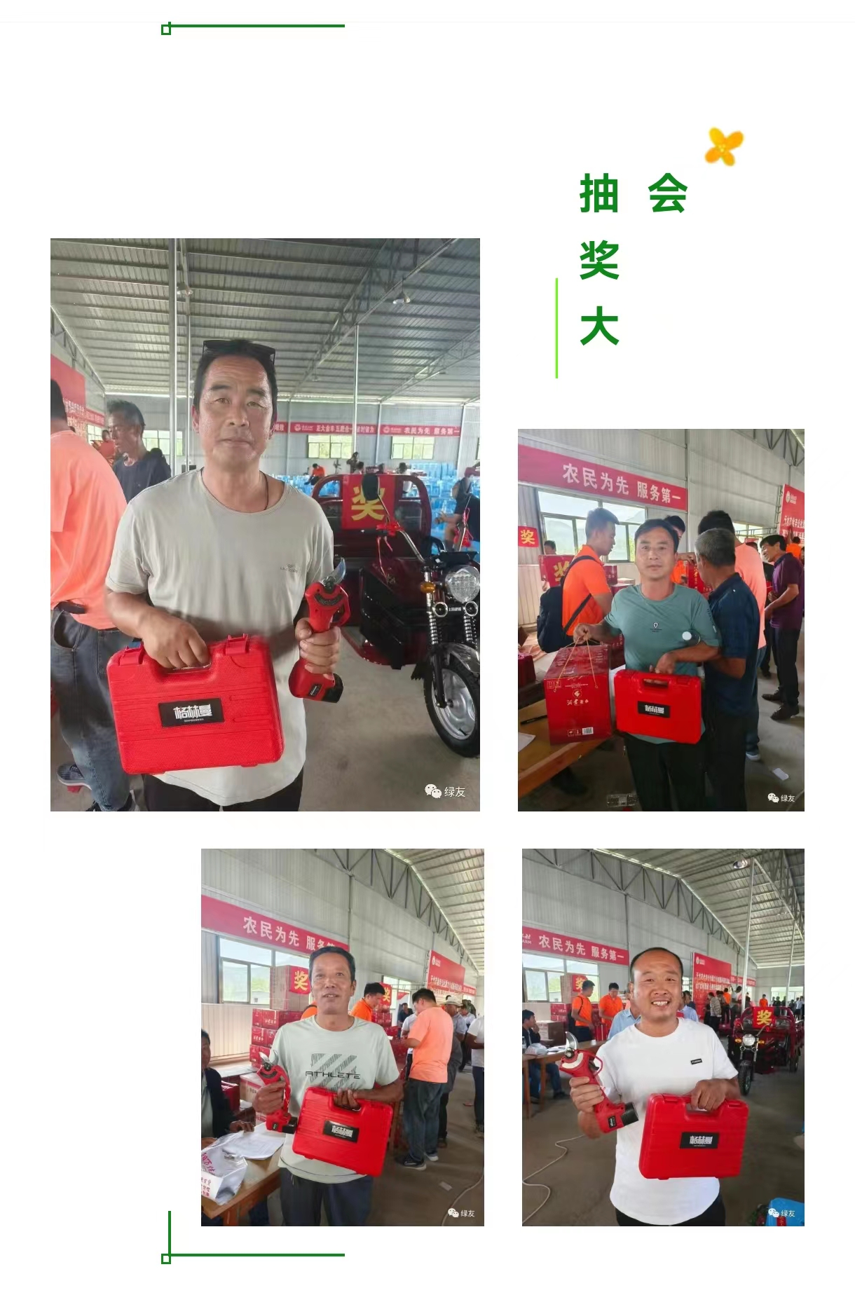 西安綠友園林機(jī)械有限公司寶雞分公司攜手某公社分別于8月24日和9月3日舉辦助力鄉(xiāng)村振興項(xiàng)目千人抽獎大會。每場次參會人員均達(dá)千余人,綠友公司的格林曼電動修枝剪作為獎品,廣受農(nóng)戶好評。