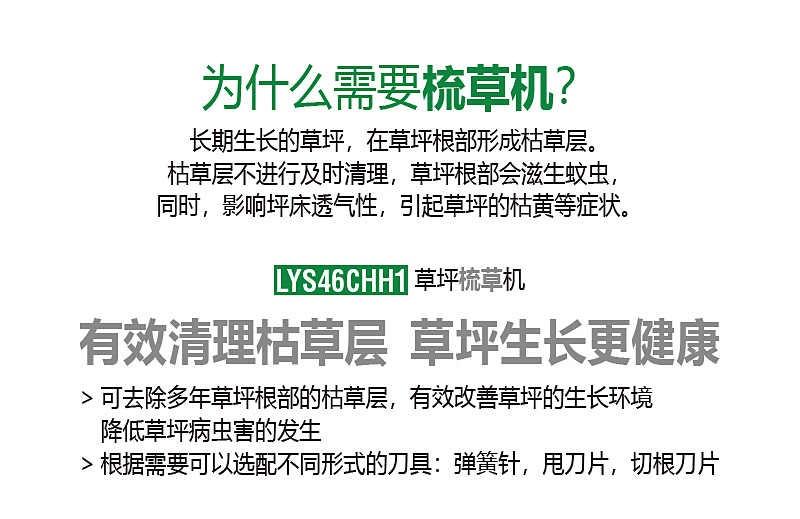 草坪生長一段時間后,底部會結出一層枯草層,時間一長,不參加光合作用,會霉變腐爛,滋生霉菌,阻礙土壤吸收氧份,導致草坪枯萎,使草坪生長不良,草坪很難看,這時噴灑藥物,不能治本,應將枯草清除。梳草機就很省事的能把枯草去除。